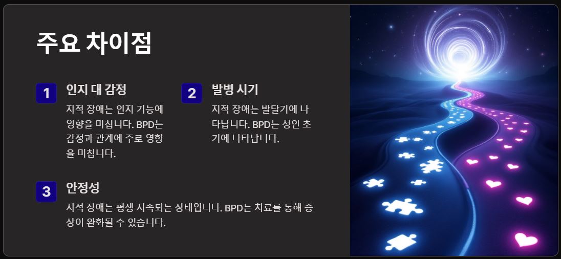 경계성 지능 장애와 지적 장애는 모두 인지적 어려움을 포함하고 있지만, 심각성과 지원 필요성이 다릅니다. 경계성 지능 장애는 학습 및 사회 적응에 어려움을 겪지만 훈련과 지원을 통해 자립이 가능하며, 지적 장애는 보다 심각한 기능 저하로 인해 지속적인 도움이 필요합니다.