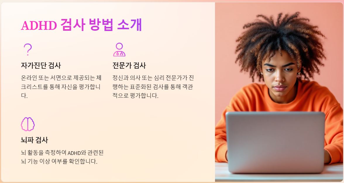 🚀 ADHD가 의심된다면? 먼저 자가진단 테스트를 진행하고, 증상이 지속된다면 정신과 진료를 받아보세요. 빠른 진단과 적절한 치료로 더 나은 삶을 만들어갈 수 있습니다! 😊