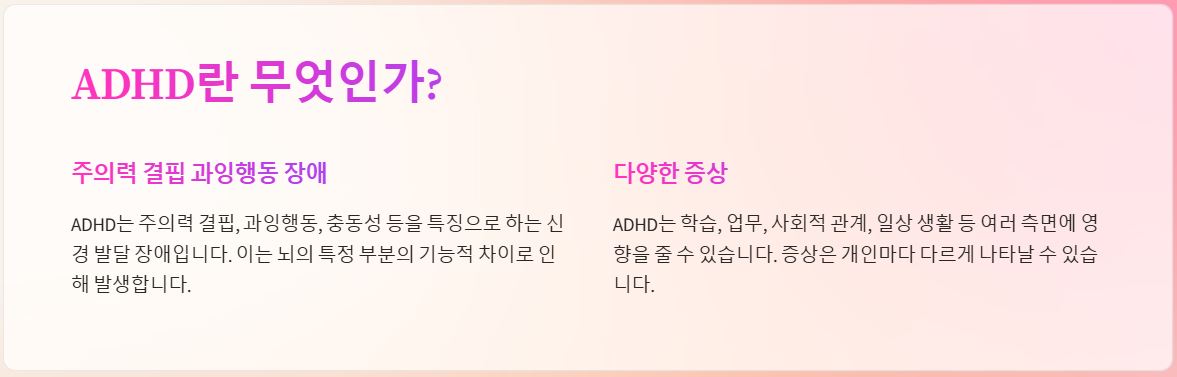 ✅ 결과 해석: ADHD 가능성이 높게 나온다면, 정신건강 전문가 상담을 추천합니다.